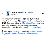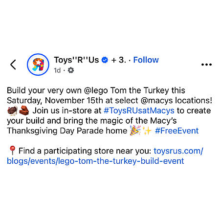 Start your holiday celebrations early with a free LEGO Tom the Turkey Build Event on Saturday, November 15th from 12-2PM at select Toys"R"Us at Macy's locations! Get excited for an exclusive Tom the Turkey mini build & coloring activities, plus you just might get to see Geoffrey! While supplies last.