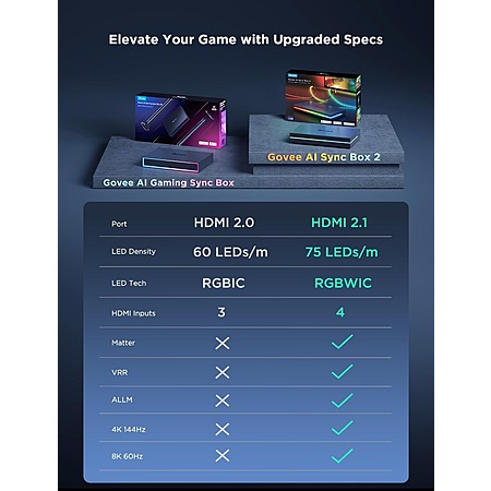 Model: Govee HDMI 2.1 Sync Box 2, AI Sync Box with TV Backlight, Supports 8K@60Hz, 4K@144Hz, VRR and ALLM, Works with Matter and Alexa, RGBIC LED Light Strip for 55-65 inch TVs, 75 LEDs/m