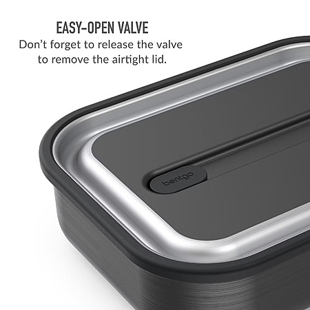- Easy-Open Valve: To open your Bentgo MicroSteel lunch box, lift the venting valve on the top of the lid. This releases internal pressure, making it easier to remove the lid without force. Once open, lift off the lid and enjoy your meal!