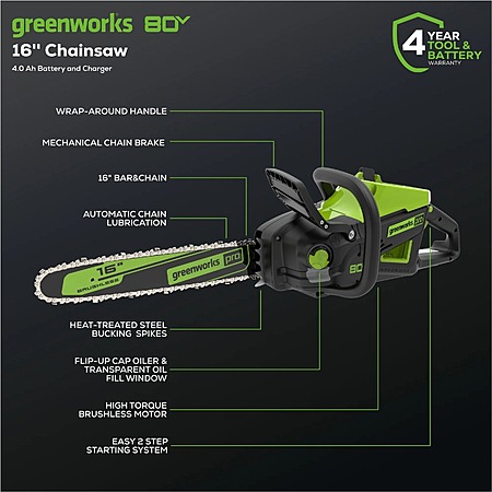 What's Included:- Greenworks 80V 16" Cordless Brushless Chainsaw