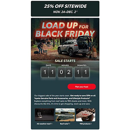 Save 25% on all Toyota Genuine Parts and Accessories, and Lifestyle Products.
