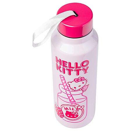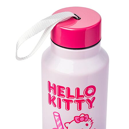 - Protect your drinks from the sun and stay hydrated all day long in this adorable Hello Kitty reusable water bottle. Bottle is designed with a pink background, a kitty's favorite drink strawberry milk, and Hello Kitty on the front sporting her classic pink bow.