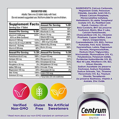 - Multivitamins for Women Over 50 Centrum Silver Women's Multivitamin for Women 50 Plus brings you a tailored multivitamin/multimineral supplement that contains micronutrients to help support full body wellness (1). This women's vitamin with iron contains essential nutrients, including vitamin D and calcium to support strong bones and B Vitamins to help promote heart health (1, 2). This multivitamin for women over 50 also contains zinc and B Vitamins to help support normal brain function and Vitamins A, C, and E for eye health (1, 2). Key micronutrients in these multivitamins with zinc supplements help fill in nutritional gaps to promote overall wellness and vitality (1). These women's vitamins are verified Non-GMO (3) and gluten free. This women's multivitamin with iron features a smooth coating that makes it easy to swallow. Simply take one multivitamin daily to provide your body with essential vitamins and minerals. Help support full body wellness (1) with Centrum multivitamins for seniors, clinically shown to support cognitive health in older adults (1) from the #1 doctor and pharmacist recommended multivitamin brand. (1) These statements have not been evaluated by the Food and Drug Administration. This product is not intended to diagnose, treat, cure or prevent any disease. (2) Not a replacement for cholesterol-lowering drugs (3) Read more about our Non-GMO standard on Centrum.com