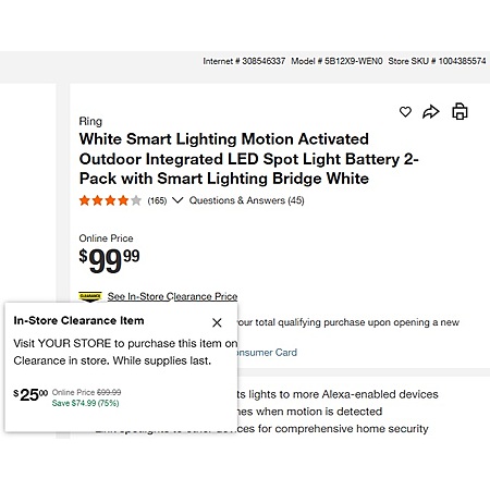 Select Home Depot Stores have Ring White/Black Smart Lighting Motion Activated Outdoor Integrated LED Spot Light Battery 2-Pack with Smart Lighting Bridge White $25. Pricing/offer is valid for in-store purchase only. Stores that still have stock will have a "See in-store clearance price" link under the $99.99 Online price. YMMV