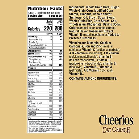 - Whole grain oats are the first ingredient; Each serving contains 30g of whole grain (at least 48g recommended daily); About 9 servings in every Cheerios Oat Crunch Cereal large size box
