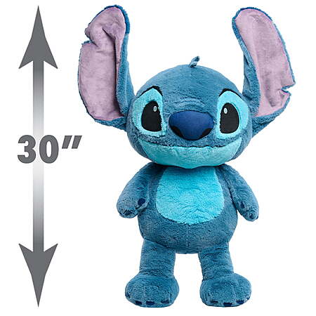 | Product Description: | Get ready for a galactically good time with the Disney Jumbo Plush Stitch doll. This fantastic alien plushie stands 30 inches tall and features multitextured fabrics, embroidered and appliqued facial features, and soft pink fabric inside his ears. Disney Stitch is perfect for huge, out-of-this-world hugs, imaginative adventures, and may even make a silly dance partner. As a beloved character inspired by the stories of Disney’s Lilo & Stitch, this supersized plushie is sure to have an extra-large, extraterrestrial place in any kid’s collection of stuffed animals and Disney toys. He’ll look fantastic sitting on a bed, lounging in a dorm room, or as a fun photo prop at parties. This Disney Stitch plush toy makes a great birthday gift, holiday present, and anytime surprise toy for kids ages 2 years and up. Includes: Disney Stitch plush toy. Bigger Is Definitely Cuddlier: Get ready for an out-of-this-world good time with the Disney Jumbo Plush Stitch doll. Giant Disney Plushie: Made of super-soft fabrics, this 30-inch-tall Stitch plush doll is perfect for day-to-night snuggles, galactically cool dance marathons, and life-sized displays Wonderful Craftsmanship: Stitch is artfully sculpted with appliqued facial details and beautiful embroidery. Fractal-shiny pink fabric inside his ears make him irresistibly colorful and charming. Play or Display: This amazing alien plush toy is great for imaginative play, snuggly naptime, or as a fun addition to kid’s collection of stuffed animals and Disney toys. He looks as good as part of themed party décor as he does next to a special kid. A Big Idea: For the most imaginative tea parties, sleepovers, and anytime fun with family and friends, collect all of the Disney Jumbo Plush dolls, including Mickey Mouse, Minnie Mouse, Stitch, and Jack Skellington. Each sold separately. Give the Gift of Disney: Officially licensed Disney plush toys by Just Play make wonderful holiday gifts, birthday presents, and anytime surprises for collectors, Disney fans, kids, and the young at heart. Ages 2 years and up |