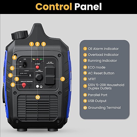 Comprehensive Display: Features a three-in-one digital display showing voltage, frequency, and remaining runtime, along with oil warning, overload, and running indicators for easy monitoring.