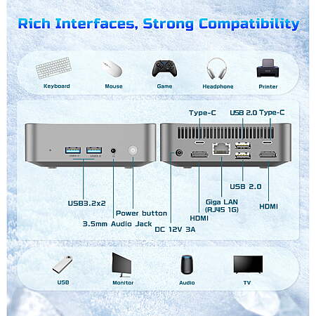 | Product Description: | Specifications Brand: SOYO Processor Type: Intel 12th GEN N95 Processor Brand: Intel RAM Memory:8GB DDR4 Hard Drive Capacity: 256GB Wireless Technologies:WIFI 5 Bluetooth Product condition: Brand New Small Form Factor PC: 4.41 x 4.41 x 1.5 inches 349Grams Ports: Power Button; 2*USB3.2 2*HDMI 2.0; 2*USB 2.0 2*TPYE-C DC 12V 3A Giga LAN(RJ45) 1G 3.5mm Audio Jack Package Contents: Charger SOYO M4 Mini air pc HDMI Cable Instruction Manual Bracket đ„ ăPowerful Latest 12th Gen Intel ProcessorăExperience a new level of efficiency with the 12th Gen Intel Alder Lake N95 Processor, boasting a max burst frequency of 3.4GHz. With modern architecture and intelligent core allocation, this CPU handles everyday tasks with easeâfrom office applications and web browsing to 4K video playback and light creative work. Itâs an ideal processor for home, office, and classroom use. đŸ ăAmple Memory and StorageăWith 8GB of DDR4 RAM, run multiple applications smoothly without lag. The 256GB SATA M.2 2280 SSD offers not only fast boot and load times but also quiet, reliable storage with no moving parts. Itâs perfect for storing documents, media, and applications, with optional expandability for more storage. đ„ïž ăDual HDMI and Versatile ConnectivityăConnect up to three displays simultaneously via dual HDMI ports, each supporting 4K resolution. Broaden your workspace or enjoy a multi-screen entertainment setup. With included USB-C, USB 3.2, and USB 2.0 ports, you can easily attach keyboards, mice, hard drives, printers, and more. đ ăHigh-Speed NetworkingăEnjoy lag-free online experiences with Gigabit Ethernet, dual-band Wi-Fi 5, and Bluetooth 4.2. Whether youâre video conferencing, streaming content, or transferring files, this device keeps you connected with stable and high-speed options. đŠ ăCompact and Space-Saving DesignăIts small form factor fits almost anywhereâbehind a monitor, on a desk, or mounted under a table. Designed to blend into any environment, itâs as stylish as it is functional, freeing up space while delivering full PC performance. đż ăEnergy-Efficient and Quiet OperationăThe Intel N95 chip is engineered for low power consumption and minimal heat, enabling fanless or ultra-quiet operation. No distracting noisesâjust reliable and cool performance thatâs also kind to your electricity bill. |