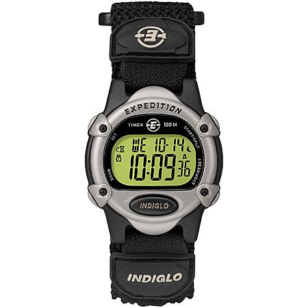 - Black & silver-tone 34mm resin case with acrylic lens; green digital display; Indiglo light-up watch dial