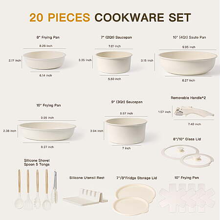 | Product Description: | Versatile Nonstick Cookware for Healthy Cooking Anywhere Upgrade your cooking experience with the Astercook 20-Piece Nonstick Ceramic Pots and Pans Set. Designed for versatility and convenience, this cookware set features a nonstick ceramic coating that ensures healthy, low-fat cooking with effortless food release and easy cleanup. The removable handles allow for seamless transitions from stovetop to oven, perfect for compact kitchens, RVs, and small spaces. Space-Saving, Durable, and Multi-Stovetop Compatible Thanks to its stackable design, the entire set stores neatly to maximize space, while compatibility with induction, gas, ceramic, and electric stovetops ensures even heat distribution for reliable cooking results. Built from high-quality aluminum and oven-safe up to 400°F, this cookware is made to last through years of culinary adventures. With Astercook's commitment to quality and customer service, you can cook confidently, knowing that each meal will be a success. Brand: Astercook Specification: 20 PCS Pots and Pans Set Material: Aluminum, Ceramic, Granite Handle Material: Bakelite with Silicone Coating: Ceramic Health Coating Item dimensions: 13.3"D x 12.6"W x 7.2"H Item Weight: 10.5 Pounds High Performance Non-Stick Coating: Astercook's premium non-stick surface provides top durability and easy release from the pan. Easy to clean, ensuring healthier cooking every time. Secure & Removable Handle: The innovative removable handle locks firmly into place, giving you a stable grip for confident cooking. Easily switch between stovetop and oven or detach for compact storage. Space-Saving & Easy to Clean: Save storage space with the detachable handle design, and enjoy hassle-free cleaning. Simply remove the handle for quick, thorough washing to keep your kitchen neat and organized. Compatible with All Stovetops: Whether using induction, gas, or ceramic hobs, our cookware ensures even heat distribution for consistent cooking results across all heat sources. Durable Design & Quality Support: Made from high-grade aluminum and tested for long-term use, both the pots and handles are built to last. Enjoy peace of mind with reliable performance and exceptional customer service from our brand. |