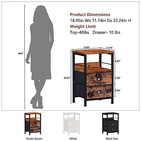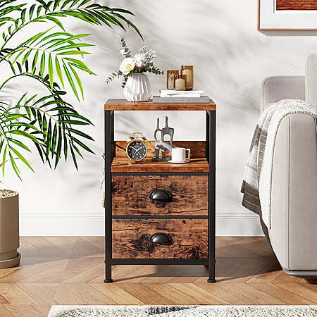 | Product Description: | Upgrade your bedroom with Satifur nightstands. Featuring removable fabric drawer and open shelf, these table match any decor style and provide ample storage.Use them as nighstand, beside table, dresser, end table, or toy organizer. Each of fabric drawers is designed with pull handles,so you can easily reach everything you want. Whether you're looking for a coffee table, side table or nightstand, Satifur can be satisfactory! Specification: Color: Rustic Brown Material: Particleboard + Metal Product Dimensions: 11.74"D x 14.95"W x 22.24"H Package include: 2 x Night Stand 4x Hooks 1 x Manual Satifur Nightstand Set of 2 with Drawers and Shelf Bedside End Table for Bedroom, Livingroom, Rustic Brown: 【Nightstand with Charger Station】This nightstand features with 2 AC outlets and 2 USB ports, provideing more charging spots for bedtime, your phones and your lamps. 【Bedside Table Set of 2】Our bedside table featuring a sleek outlook design makes this side table with storage easily immerse into any home room. This end table is equipped with 2 detachable fabric drawer and an open shelf, seamlessly enhancing any decor. They not only bring a sophisticated flair to your environment but also offer generous storage for all your nighttime necessities. 【Multiple Use Occasions】The sleek outlook design makes this side table with storage easily immerse into any home room. Place it beside the sofa as a narrow side table, set it up as a bedroom nightstand, or put it in the apartment as a storage end table. It is a super excellent complement to livingroom,bedroom,hallway,dorm,etc. 【Durable and Long Lasting】Built with a sturdy steel frame and a water-resistant wooden top, our nightstand is made to last. The easy-to-grip handles simplify the process of opening and closing the drawers, while the four adjustable feet prevent unsightly scratches on your flooring. You can trust that this nightstand is designed for longevity. 【Solid Structure】We recognize the necessity for stability and balance in furniture. Our compact table features adjustable legs to guarantee a firm and level surface, even on slightly uneven ground. Say goodbye to wobbling! Just tweak the legs to restore the table to perfect steadiness. 【Help to Assemble】 No complicated steps, with instruction, numbered components and tools, this side table will be finished quickly |