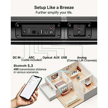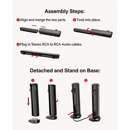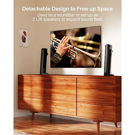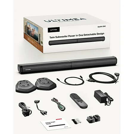| Product Description: | NOTE: At ULTIMEA, we highly value individual sound preferences and offer a diverse range of personalized EQ programs to cater to your unique requirements. If you find the need, please reach out to us for balanced bass, enhanced bass levels, treble adjustments, improved sound quality, clearer vocals, EQ fine-tuning, volume reduction and more. Experience best of both world with the Apollo S40. Say goodbye to the limitations of conventional wired subwoofers. With our built-in dual bass boosters, experience a colossal 4-6x sound enhancement. Thanks to the revolutionary ULTIMEA Bassmax technology, customizing your bass output is now a reality. Our detachable design ensures seamless multi-scenario adaptability while adding an artistic touch to your setup. Elevate your audio experience today!. Double Bass-- Built-in Dual Subwoofers: 2.2 ch sound bars for tv equipped with 2 subwoofers and 2 tweeters. The unique deepen circular shape combined with 4-6x hardware power maximizes the depth of sound for more punchy bass, resulting in less distortion and greater clarity. Versatile Shape--Detachable Design to Free Up Space: The split design of our TV soundbar allows you to occupy less space while still enhancing the sound field. Assemble in your preferred style according to the layout and atmosphere of the room. Personalized Sound Experience: Elevate your audio with 3EQ modes designed for music, movies, and games. Ultimea exclusive BassMaX technology enriches the low frequencies, enabling adjustable bass for a rumble, pulse-pounding Bass. All of these modes are easily accessible with a touch of a button on the EQ settings. Fuller, Clearer--Take Your Senses To The Limit: Adopts 2023 upgraded DSP chip ensures the sound bar does not carry static in the audio. No buzz, fuzz or delayed sound. Hear every word and sound exactly as it was meant to be heard. Seamless Connectivity--Wired 2.2 Channel Soundbar Stable Treble + Bass—With 4 powerful speakers Detachable Design—Free up space and enhance sound field Personalized sound—Provides a variety of EQ modes and Bassmax adjustable. Seamless Connectivity—HDMI-ARC, Optical, AUX, USB, Bluetooth Setup, Simplified—CEC Control Option Available, ARC Cable included Liberty Combination—Desktop, Wall Mount, L/R Desktop, L/R Wall Mount |