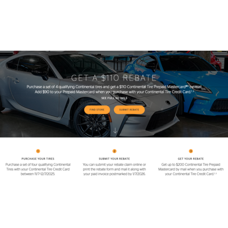 *MAIL-IN REBATE WITH QUALIFYING CONTINENTAL TIRE PURCHASE OFFER: Valid only with qualified purchase made in the 50 United States, Washington, D.C., and Puerto Rico between 11/07/2025 and 12/07/2025 or while supplies last. Void where restricted or prohibited by law. No rain checks. Submission must include copy or original, dated, paid, itemized receipt and invoice for the purchase of four (4) new qualifying CONTINENTAL TIRES from a participating retail dealer and a completed rebate form. For online purchases, an original, dated, itemized proof of installation also must be submitted. Offer may not be combined with any other offer, discount, rebate, or promotion. Tires must be purchased in a single transaction. Rebate form must be postmarked or submitted online by 01/07/2026. Offer not valid on purchase by wholesalers, dealers, fleets, OEM customers, or other commercial entities or on returned merchandise. Requests from those with an invalid or undeliverable mailing address will be denied. Limit two (2) Continental Tire Prepaid Mastercard cards per person, household, email or address. The Prepaid Mastercard is given to you as a reward, refund, rebate and no money has been paid by you for the card. Physical card is issued by Pathward®, N.A., Member FDIC, pursuant to a license by Mastercard International Incorporated. Mastercard and the circles design are registered trademarks of Mastercard International Incorporated. No cash access or recurring payments. Card can be used where Debit Mastercard is accepted. Card valid for up to 6 months; unused funds will forfeit after the valid thru date. Terms and conditions apply. Not responsible for late, lost, stolen, misdirected, illegible, mutilated, or postage due to mail or inability to connect to the website. Any taxes, fees, or costs, including but not limited to installation, are sole responsibility of the recipient. Allow 8 to 12 weeks for fulfillment. Each time you use the card, the amount of the transaction will be deducted from the amount of your available balance. Card will be issued in the name on the rebate form only. Expiration date of card is on the front of card. Card is non-transferable.