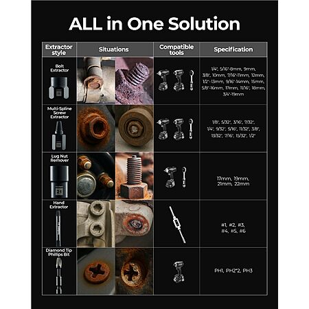 • Bolt extractors: 1/4", 5/16"-8, 9, 3/8", 10, 7/16"-11, 12, 1/2", 13, 9/16"-14, 15, 5/8"-16, 17, 11/16", 18, 3/4"-19