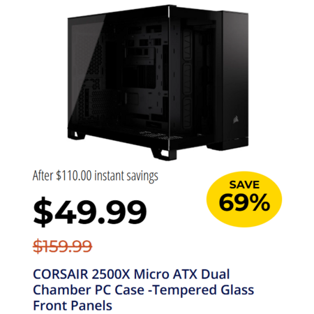 Beginning November 20th, Newegg [newegg.com] will have CORSAIR 2500X Micro ATX Dual Chamber PC Case w/ Tempered Glass Front Panels (Black) for $49.99. Shipping is free.