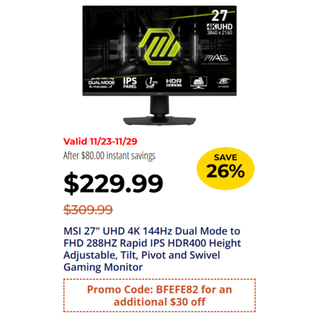[Starts Nov 23] 27" MSI MAG 275UPD E14 288Hz 4K UHD Rapid IPS Gaming Monitor $199.99 + Free Shipping