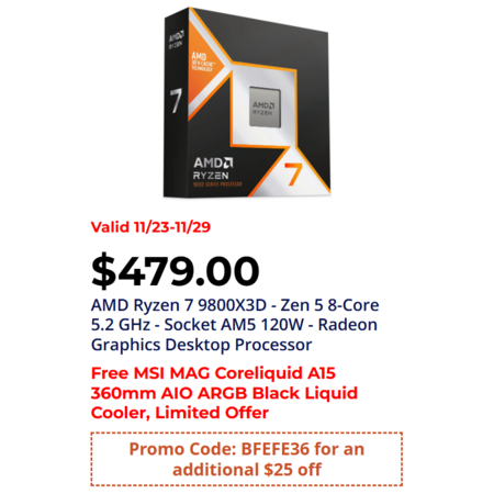 [Starts Nov 23] AMD Ryzen 7 9800X3D CPU + MSI MAG 360mm AIO Liquid Cooler $454 + Free Shipping