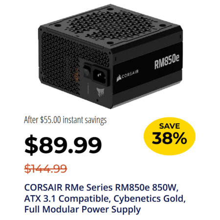 [Starts Nov 20] 850W CORSAIR RM850e ATX 3.1 Gold Full Modular Power Supply $89.99 + Free Shipping