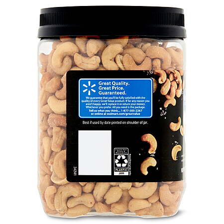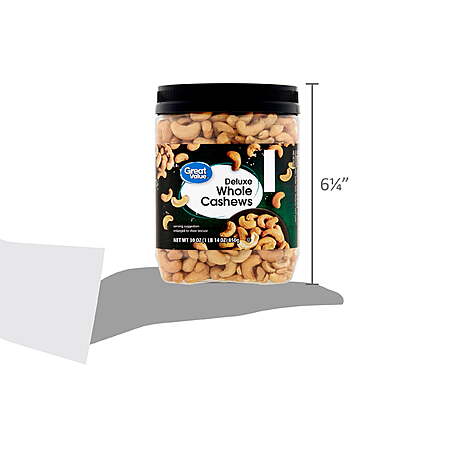| Product Description: | Great Value Deluxe Whole Cashews are a flavor-packed crunchy snack that leaves you feeling satisfied. The rich jumbo-size cashews are roasted in oil and deliciously seasoned with sea salt, creating a go-to snack that you crave. Packed in a convenient plastic jar with a twist-off lid, these fancy nuts stay fresh. The Kosher cashews have 160 calories per 1 oz. serving, so they help to fuel you until dinnertime and help you relax after a long day. Shake these party nuts into a snack bowl and serve them when friends come over or put the 30 ounce jar of cashews in any easy-to-reach place where you can grab the roasted nuts and enjoy a quick handful. Great Value Deluxe Whole Cashews are a healthy and satisfying snack to reach for any time of day! Great Value products provide families with affordable, high quality grocery and household consumable options. With our wide range of product categories spanning grocery and household consumables, we offer you a variety of products for your family's needs. Our products are conveniently available online and in Walmart stores nationwide, allowing you to stock up and save money at the same time. Great Value Deluxe Whole Cashews, 30 oz: Convenient jar with a resealable lid keeps the cashews fresh Seasoned with sea salt for great taste Roasted in oil for perfect crispness Kosher |