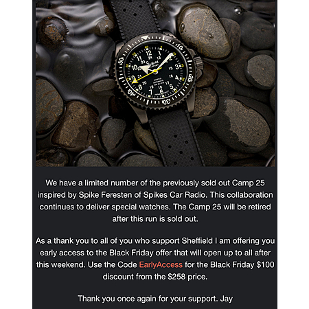 We have a limited number of the previously sold out Camp 25 inspired by Spike Feresten of Spikes Car Radio. This collaboration continues to deliver special watches. The Camp 25 will be retired after this run is sold out.