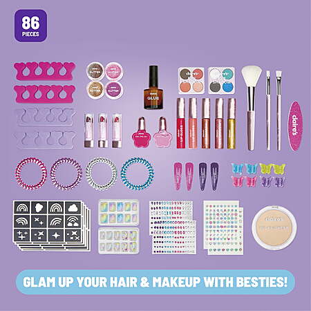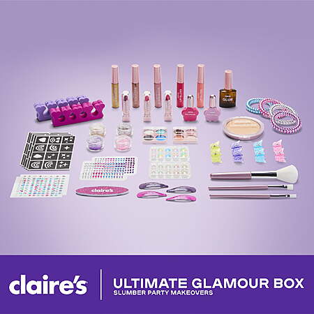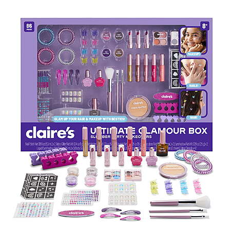 | Product Description: | Get ready for a glam transformation with the Claire’s® Ultimate Glamour Box! This 86-piece beauty kit is packed with colorful makeup, hair accessories, press-on nails, and glitter tattoos for hours of makeover fun. Girls can mix and match lip gloss, eyeshadow, nail stickers, and hair clips to create bold new styles every time they play. Use the included stencils, body glue, and glitter pots to design sparkly temporary tattoos, then add clips and coils to finish the look. From solo spa days to sleepover makeovers, this set is designed for creative play and self-expression. It’s safe, stylish, and totally gift-worthy—perfect for girls ages 8 and up who love to glam it up with their besties. 86-piece makeover set for hair, nails, glitter tattoos, and makeup Press-on nails with stickers and gems for custom nail designs Add bold eyeshadow, lip gloss, lipstick, and highlighter Use glitter, body glue, and stencils to design sparkly tattoos Perfect glam gift for birthdays or creative play Empowering you to express and celebrate the many sides of you Model: 1019027 |