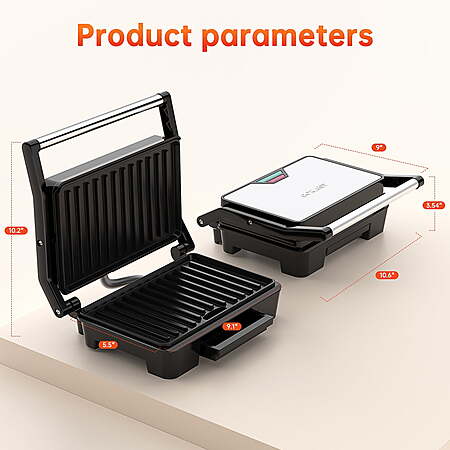 | Product Description: | Fast & Even Heating 850 W high-power output with uniform heating technology allows you to quickly make a delicious meal; an ideal option for enjoying authentic grilled food even when your schedule has you constantly on the go. Large Cooking Surface The 9.1x5.5 inch heating plate on this panini grill allows for suitable cooking space. Grill burgers, steaks, sandwiches, paninis, vegetables and more, meets any and all indoor grilling needs. Non-Stick Coating & Easy Cleanup Constructed from food-grade aluminum, the non-stick cooking plates ensure reliable use, giving you crisp, golden-brown results; Comes with a drip tray that catches excess fats and liquids, it is convenient for using and cleaning.Stainless Steel exterior is simple to be wiped by the damp cloth. LED Indicator There are red and green indicator lights to show the working process, red light is power indicator, green light is heating indicator, when the electric panini grill is plugged in, the 2 indicator lights turn on together, after it reaches the setting temperature, the green light turns off. Compact Size Ideal for small kitchen spaces, dorm rooms, offices, and even bringing on road trips! The compact size takes up little counter or shelf space making storing your contact grill easy. Specification Color: Sliver&Black Material: Stainless Steel Product Dimensions: 10.6" Wx 8.7"Hx3.5"D Wattage: 850W Voltage: 110 Volts Healthier meals are a possibility with this sandwich press. This panini maker used advanced grease channeling system which helps to cut grease and decrease fat from your food while it cooks. Breakfast sandwich press heats ingredients, melts cheese and creates a crispy outer crust for a satisfying meal with one easy press. Expect bread slices, you can freshly toast English muffins, bagels, quesadillas inside the sandwich toaster. Forget the frying pan and make hot sandwiches the easy way in just 5 minutes or less with this sandwich grill; ready to cook lights will indicate when the grill is hot and ready to use. Floating hinge- adjusts to accommodate any size sandwich(thick or thin). Closed cooking surface of 5.5'' x 9.1'' is ideal for two sandwiches, variety of food. Great for a quick meal, summer party or a family event. It boasts a 850 watt motor and automatic thermostat OK for grilling egg, whole chicken breasts, steaks. Also perfect for panini, focaccia, pita, baguette and more. An ideal gift for housewarming, Thanksgiving, Christmas, or wedding. |