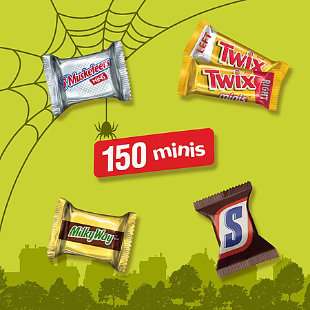 Contains one (1) 2.61-pound, 150-count bulk variety bag filled with Mars Mixed SNICKERS, TWIX, MILKY WAY & 3 MUSKETEERS Milk Chocolate Minis Individually Wrapped Halloween Candy