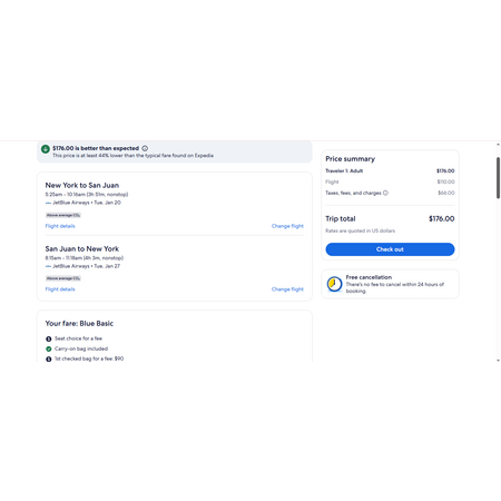 JetBlue and Expedia have round trip airfares travelling to and from New York (JKF) and San Juan Puerto Rico (SJU) for $176, nonstop. These are basic economy fares that allow a personal item and a carry-on bag. There is no seat selection and no change. If you are travelling with children, you will be seated together as per JetBlue's policy.