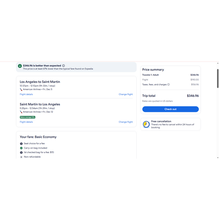 American Airlines and Expedia have round trip airfares travelling from Los Angeles (LAX) to St Maarten (SXM) for $347, making 1 stop. These are basic economy fares that allow a personal item and a carry-on bag. There is no seat selection and no change. If you are travelling with children, you will be seated together as per AA's policy.