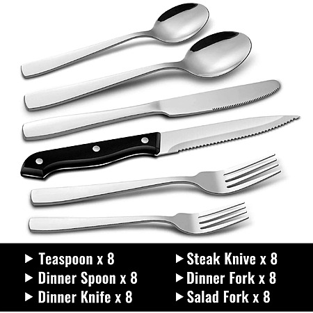 Set Includes 8 dinner forks, 8 salad forks, 8 dinner knives, 8 steak knives, 8 dinner spoons, and 8 teaspoons, covering all your dining needs.