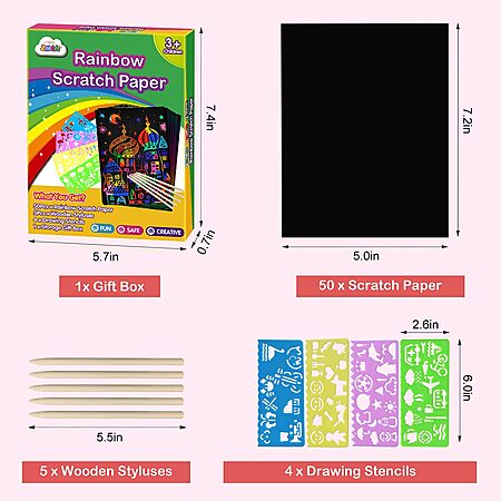 - Surprise Scratch Drawing Paper Art Set: 50Pcs x black rainbow paper (7.2 * 5 inch), 6 x wooden styluses, 4 x color drawing stencils. A new way of drawing, let your children experience endless fun in the exploration of art