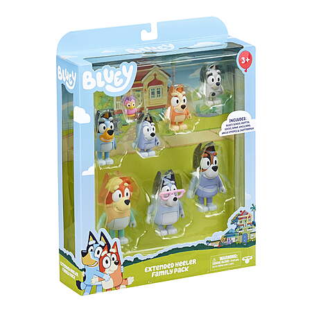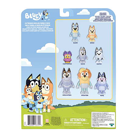 Bring the fun and imaginative play of Bluey home and her family home with this exclusive Extended Heeler Family Pack! There are 8 of Bluey's extended family in this Pack to play with! - Bluey, Bingo, their cousins Socks and Muffin, Uncle Stripe, Uncle Rad, Nana and even Chattermax! Every 2.5 -3 inch Figure in this Pack is articulated and has moving arms and bodies. They are just the right size for pre-school hands to move and play with. Children and toddlers will love to recreate some of the most memorable moments from the show with these adorable Bluey toys! All Figures work with all the other Bluey Playsets. Look out for other Bluey 4 Packs and build up Bluey's World at home! Bring the fun and imaginative play of Bluey and her family & friends home with this exclusive Extended Heeler family Pack! There are 8 of Bluey's extended family in this Pack to play with! - Bluey, Bingo Chilli (Mum) Bandit (Dad), their cousins Socks and Muffin, Uncle Stripes, Uncle Rad, Nana and even Chattermax! Every 2.5 -3 inch Figure in this Pack is articulated and has moving arms and bodies. All Figures work with all the other Bluey Playsets. They are just the right size for pre-school hands to move and play with. Bluey is a loveable, six-year-old Blue Heeler dog, who loves to turn everyday family life into endless, playful adventures. Bring the fun and imaginative play of Bluey and her family home with these adorable Bluey toys!