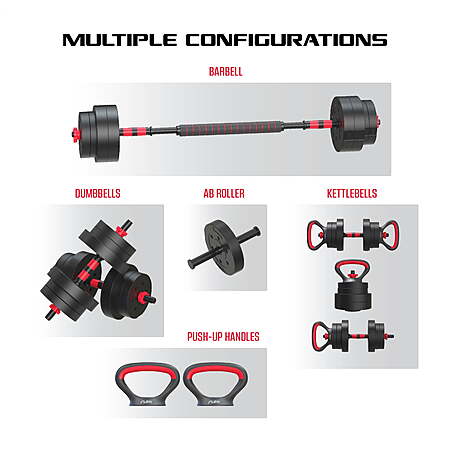 | Product Description: | Upgrade your home gym with the FitRx Smartbell Gym, a versatile 5-in-1 system that replaces clutter with functionality. This all-in-one dumbbell set includes 12 weight plates (40 lbs total) that can be assembled into dumbbells, a barbell, kettlebell, ab roller, or push-up stand. Its modular design helps you target multiple muscle groups without filling your space with bulky home gym equipment. Built for flexibility and performance, the Smartbell Gym works as an adjustable dumbbell set to scale your training as you progress. Use the soft-grip dumbbell bars for bicep curls and rows, the connector bar for squats and bench press, or the kettlebell base for swings and lunges. Unlike basic dumbbells, this complete weight set offers endless workout options in one compact kit. Crafted from durable black PE plastic with secure spin-lock collars, this home weight set is designed to prevent damage to floors and surfaces while keeping safety in mind. The space-saving design makes it easy to store when not in use, while its multifunctional build makes it ideal for squats, presses, deadlifts, and more. Whether you’re building strength or maintaining fitness, this home gym solution adapts to every level. 40 lb dumbbell set with 12 weight plates 5-in-1 adjustable dumbbell set: dumbbell, barbell, kettlebell, ab roller Durable PE home weight set prevents floor damage Modular weight set with secure spin-lock collars Compact, space-saving home gym equipment design |