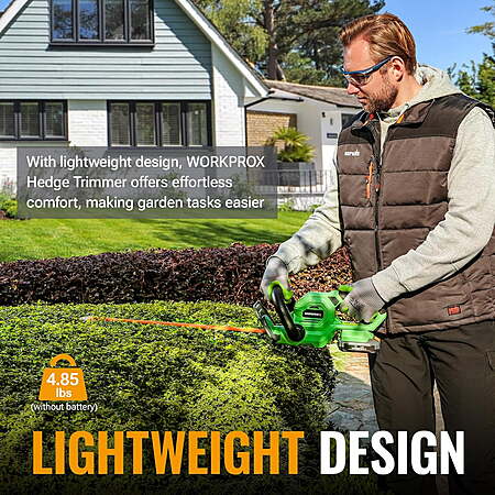 - Effortlessly Lightweight: At just 4.85 lbs, the WORKPROX 20V Cordless Hedge Trimmer is designed for ease of use. Its ergonomic wraparound handle and lever-action mechanism make trimming a breeze, ensuring you can tackle any job with comfort and control
