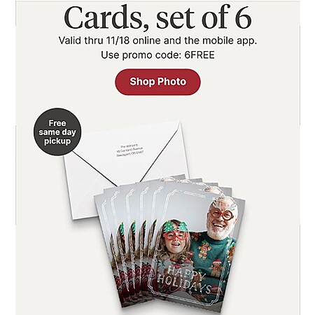 Note: Availability for same-day store pickup may vary. This offer is for a set of six identical photo cards totaling $23.99 or less.