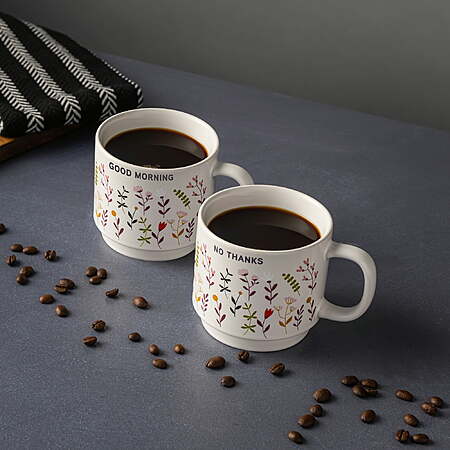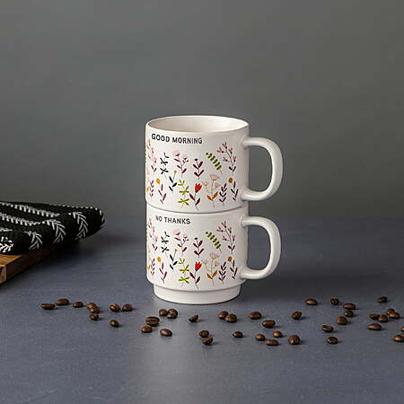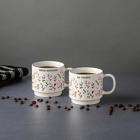 Model: Thyme & Table 2 Pack Stacking Good Morning & No Thanks with Flowers Cream Mugs 14.2 fl oz, Stoneware