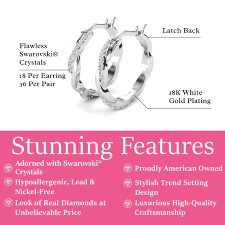 | Product Description: | Cate & Chloe Lauren 18k White Gold Plated Twisted 22mm Hoop Earrings Adorned with Swarovski® Crystals for women. Elevate your jewelry collection with the stunning Lauren Hoop Earrings, a perfect blend of elegance and modern design. These exquisite earrings are meticulously crafted with 18k white gold plating, showcasing round-cut Swarovski® crystals that radiate brilliance and charm. Designed for the contemporary woman, these earrings add a touch of sophistication and sparkle to any outfit, whether you're attending a special event or dressing up for a night out. Experience the joy of wearing jewelry that embodies both luxury and timeless appeal. STUNNING DETAILS EARRING FEATURES – Crafted with precision, these hoop earrings for women are made from brass and plated with 18k white gold, creating a stunning combination of shimmer and elegance. They feature 18 round-cut Swarovski® accent stones in each earring (36 per pair), measuring 1.5mm each, that dazzle from every angle. The overall dimensions of the earrings are 3.3mm (w) x 22.2mm (h) x 21.8mm (L), ensuring they make a bold statement while remaining lightweight and comfortable to wear. Secured with a latch back closure for a secure and comfortable fit. BEST USES - Perfect for various occasions, including bridal parties, anniversaries, birthdays, or simply elevating your everyday look. These earrings are a versatile accessory that complements any style, making them a must-have in your collection. KEEPING YOU IN MIND - We care about your skin as much as you do. These earrings are hypoallergenic, free from lead and nickel, ensuring a safe and irritation-free experience even for those with sensitive skin. FREE LUXURY GIFT BOX - Arriving beautifully packaged in an elegant jewelry gift box, these earrings make for an exceptional gift choice on birthdays, graduations, anniversaries, and other special occasions. PROUDLY USA OWNED - Shop with confidence knowing that Cate & Chloe is a leader in quality designer jewelry, committed to providing the highest level of craftsmanship and timeless designs that you can showcase from the office to any glamorous event. WARRANTY AND BRAND PROMISE - Cate & Chloe offers a 30-day warranty on this product. We stand by the quality of our jewelry, ensuring customer satisfaction is our top priority. Wear your jewelry with confidence, knowing that each piece is crafted to last. |
