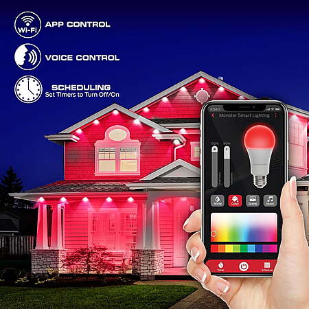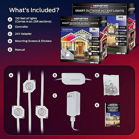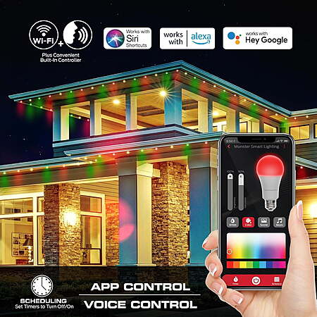 Transform your outdoor space with the Monster Smart Outdoor Accent Lights, featuring 150ft of RGB lights and multiwhite technology. This lighting solution provides dazzling displays with the ability to show multiple colors at once, adding a vibrant touch to any setting. Perfect for holidays like Christmas and Halloween or for year-round use, these outdoor lights offer versatility and style for your home or garden.