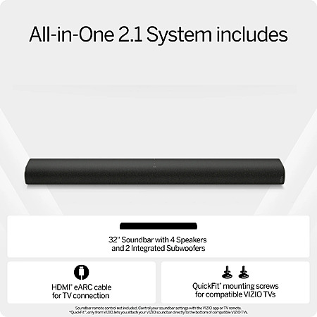 - Sound that simply fits - QuickFit eliminates the gap between this soundbar and select VIZIO TVs for a seamless setup—allowing you to attach this soundbar directly to your VIZIO TV in three simple steps, no tools needed!