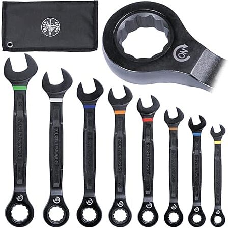 Model: Klein Tools 69408G Ratcheting Combination Wrench Set, SAE, 5/16 to 3/4 Inch, 90-Tooth Steel Alloy with Foam Pouch, 8-Piece