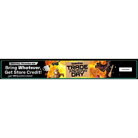 Bring Whatever, Get Store Credit! Some Questions Asked!: Exclusions include - Hazardous waste or material, chemicals, liquids. Lithium ion batteries or items containing lithium ion batteries. Weapons and ammo. Dead or alive animals (Taxidermy items are valid for trade). Alcohol, Tobacco, drugs or pharmaceuticals (legal or not). Computers (such as desktops, laptops, notebooks, all-in-ones, minis, workstations, e-readers, tablets, thin clients, smart displays, virtual reality headsets with built-in processor, interactive flat panel displays with built-in processor) excluding certain MacBooks GameStop normally accepts in trade. Computer peripherals intended for use with a computer and weighing less than 100 pounds (monitors, keyboards/keypads, mice/pointing devices, external hard drives (excluding those normally accepted in trade), facsimile machines, document scanners, printers, 3D printers, label printers, digital picture frames. Small electronic equipment (portable digital music players, VCRs, DVD players, DVRs, digital converter boxes, cable or satellite receivers, projectors including those with DVD player capability). Small scale servers. Televisions. Gift cards and other currency (foreign or domestic). Jewelry. Sexual and explicit items. Items resembling body parts. Items MUST fit in our 20x20x20 measuring box. Terms and conditions of promotion are subject to change. GameStop employees have the discretion to reject any item.