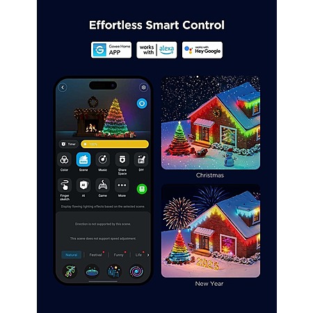 Smart Voice & App Control: Compatible with Alexa and Google Assistant for hands-free voice control of your LED christmas lights. Govee Home App offers in-depth smart features including RGBIC colors, light brightness, timers, and animation effects.