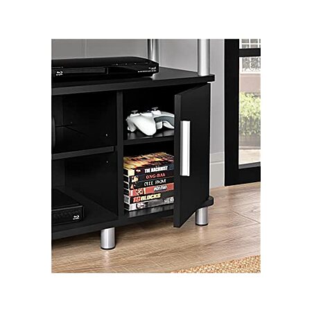 Bring your living room to the next level with the style of the Ameriwood Home Carson TV Stand. This trendy TV Stand provides plenty of places to keep your entertainment components. The raised top surface creates even more storage underneath for the perfect combination of height and functionality. This Stand features a large open compartment, 2 adjustable open center compartments and 2 cabinets with adjustable shelves to hold all your entertainment must haves. The Carson TV Stand accommodates up to a 50" flat screen TV or up to 60 lbs. The cherry woodgrain and black finishes on the laminated MDF and particleboard with the silver metal accents gives this TV Stand a contemporary style sure to complement any room's décor. The TV Stand ships flat to your door and requires assembly upon opening. Two adults are recommended to assemble. Once assembled, the Carson stand is 20.5"H x 47.2"W x 15.75"D.