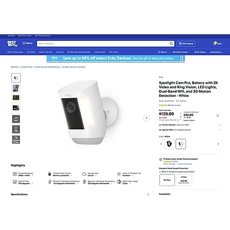 Best Buy Black Friday Deal: Ring Spotlight Cam Pro, Battery with 2K Video and Ring Vision, LED Lights, Dual-Band Wifi, and 3D Motion Detection (Black/White) $139.99