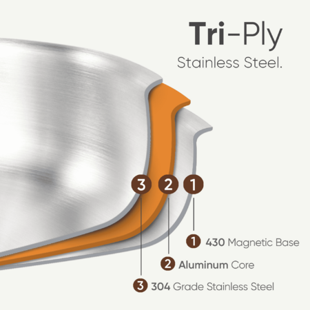 - 【Tri-Ply Stainless Steel Construction】: Built with a 304 stainless steel interior, thick aluminum core, and 430 magnetic stainless-steel exterior for fast, even heating and stable performance on all stovetops, including induction. No coating — naturally healthy cooking surface.