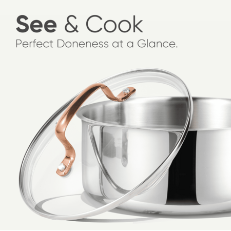 Upgrade your kitchen with the Carote Tri-Ply Stainless Steel Saucepan — perfect for warming milk, cooking oatmeal, simmering soup, or preparing sauces and small meals. The 3-layer stainless steel design with aluminum core delivers fast, even heating on all stovetops, including induction. A mirror-polished finish and gold PVD riveted handle bring a modern yet timeless touch, while the stay-cool handle ensures a secure, comfortable grip. With a clear glass lid for easy monitoring and an uncoated stainless interior for natural cooking, this small stainless steel saucepan balances style and everyday performance.
