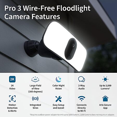 Model: Arlo Floodlight pro 3 Indoor/Outdoor 1-Camera Battery-operated Floodlight Internet Cloud-based Security Camera System in Black | FB1001B-100NAS