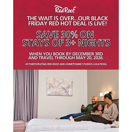 TERMS: 30% offer applies to stays of a minimum 3 nights booked November 18 – December 3, 2025 for stays occurring November 18, 2025 – May 20, 2026. Good at participating Red Roof Inn, Red Roof PLUS+, HomeTowne Studios by Red Roof and The Red Collection hotels. Must be booked via redroof.com, the Red Roof App, 1-800-RED-ROOF or the property direct. Subject to availability at participating hotels. Blackout dates may apply at some properties.
