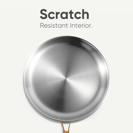 This Carote 10-Inch stainless steel frying pan features a tri-ply build for fast, even heating and natural searing performance. The coating-free surface delivers restaurant-style browning, while the gold-tone riveted handle and polished finish add a modern touch. Works with all stovetops including induction, and oven safe for versatile cooking.