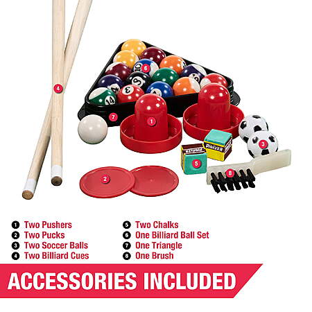 Air hockey table Billiard table Foosball table Product dimensions: 48.5 x 22.75 x 34.5 inch (LWH) This three-in-one combo table easily converts from game to game 1.5-inch leg levelers for easy assembly and table leveling Accessories included: 2 pushers, 2 pucks, 2 billiard cues, 1 billiard ball set, 1 triangle, 2 chalks, 1 brush and 2 soccer balls In order to play air-powered hockey, simply remove steel rods with quick release design In order to play foosball, just place the foosball surface on the billiard tabletop rails and lock the surfaces together. The air-powered hockey game allows for fast and competitive games. The Foosball table features steel rods, a ball return, and a manual scoring system for an authentic arcade experience The billiard table features a real felt playfield and bumpers for an authentic pool hall experience Packaging dimensions: 46.625 x 28.75 x 6.38 inch (LWH) Packaging weight (approx.): 64.36 lbs. The MD Sports 48-inch 3-in-1 Combo Game Table comes with a 90-Day Limited Manufacturer's Warranty Model# CB048Y22034 (wm.com)/ CB048Y22036 (wm.us)